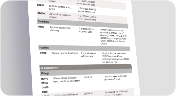 CODE SERVICE FREQUENCY BENEFIT DETAILS D0350 2D photographic image 1 procedure per Only covered when performed on calendar year same day as D9995 or D9996 D0801 3D dental surface scan, 1 of (D0801, D0802) direct every calendar year D0802 3D dental surface scan, 1 of (D0801, D0802) indirect every calendar year D0803 3D facial surface scan, 1 of (D0803, D0804) direct every calendar year D0804 3D facial surface scan, 1 of (D0803, D0804) indirect every calendar year Cleanings D1110 Routine adult dental 2 procedures per Cannot be performed on the cleaning calendar year same day as another type of cleaning (D4355, D4910, D4341, D4342) or gum surgery (D4210, D4211, D4240, D4241, D4260, D4261) Fluoride D1208 Topical fluoride treatment 2 procedures per 2 topical fluoride treatments calendar year (D1208) or desensitizing medication applications (D9910) per calendar year Comprehensive Fillings D2140 Silver-colored filling on Unlimited 1 procedure per surface per D2150 front, middle or back teeth tooth every 2 years D2160 D2161 D2330 White-colored filling on Unlimited 1 procedure per surface per D2331 front teeth tooth every 2 years D2332 D2335 3