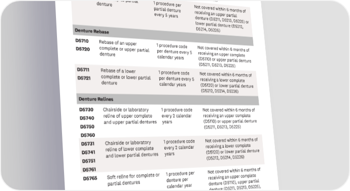 CODE SERVICE FREQUENCY BENEFIT DETAILS D5640 Replace a broken tooth or 1 procedure code Not covered within 6 months of D5650 add tooth to partial per partial denture receiving an upper partial denture per calendar year denture (D5211, D5213, D5225) or lower partial denture (D5212, D5214, D5226) D5660 Add a clasp to partial 1 procedure per Not covered within 6 months of denture partial denture receiving an upper partial every 5 years denture (D5211, D5213, D5225) or lower partial denture (D5212, D5214, D5226) Denture Rebase D5710 Rebase of an upper 1 procedure code Not covered within 6 months of D5720 complete or upper partial per denture every 5 receiving an upper complete denture calendar years (D5110) or upper partial denture (D5211, D5213, D5225) D5711 Rebase of a lower 1 procedure code Not covered within 6 months of D5721 complete or lower partial per denture every 5 receiving a lower complete denture calendar years (D5120) or lower partial denture (D5212, D5214, D5226) Denture Relines D5730 Chairside or laboratory 1 procedure code Not covered within 6 months of D5740 reline of upper complete every 2 calendar receiving an upper complete D5750 and upper partial dentures years (D5110) or upper partial denture (D5211, D5213, D5225) D5760 D5731 Chairside or laboratory 1 procedure code Not covered within 6 months of D5741 reline of lower complete every 2 calendar receiving a lower complete D5751 and lower partial dentures years (D5120) or lower partial denture (D5212, D5214, D5226) D5761 D5765 Soft reline for complete or 1 procedure per Not covered within 6 months of partial dentures denture per receiving an upper complete calendar year denture (D5110), upper partial denture (D5211, D5213, D5225), lower complete denture (D5120), or lower partial denture (D5212, D5214, D5226) 9