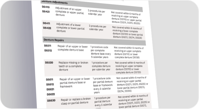 CODE SERVICE FREQUENCY BENEFIT DETAILS D5284 Unilateral removable 1 procedure code Not covered within 5 years of D5286 partial denture for the per arch every 5 receiving an upper partial upper or lower arch. This is calendar years denture (D5211, D5213, D5225) or a ‘quadrant’ denture lower partial denture (D5212, meant to only replace 1-2 D5214, D5226) missing teeth. Denture Adjustments D5410 Adjustment of an upper 2 procedures per Not covered within 6 months of D5421 complete or upper partial calendar year receiving an upper complete denture denture (D5110) or upper partial denture (D5211, D5213, D5225) D5411 Adjustment of a lower 2 procedures per Not covered within 6 months of D5422 complete or lower partial calendar year receiving a lower complete denture denture (D5120) or lower partial denture (D5212, D5214, D5226) Denture Repairs D5511 Repair of an upper or lower 1 procedure code Not covered within 6 months of D5512 complete denture base per complete receiving an upper complete denture base every denture (D5110) or lower 5 calendar years complete denture (D5120) D5520 Replace missing or broken 1 procedure per Not covered within 6 months of teeth on a complete complete denture receiving an upper complete denture per calendar year denture (D5110) or lower complete denture (D5120) D5611 Repair of an upper or lower 1 procedure code Not covered within 6 months of D5612 partial denture base or per partial denture receiving an upper partial D5621 framework base or framework denture (D5211, D5213, D5225) or every 5 calendar lower partial denture (D5212, D5622 years D5214, D5226) D5630 Repair or replace a broken 1 procedure per Not covered within 6 months of clasp on partial denture partial denture receiving an upper partial every 5 calendar denture (D5211, D5213, D5225) or years lower partial denture (D5212, D5214, D5226) 8