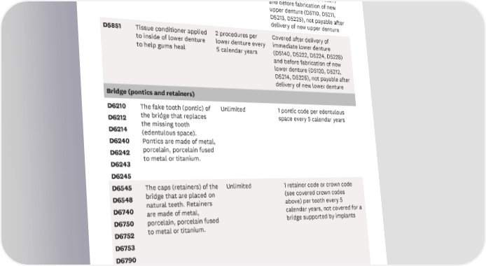 CODE SERVICE FREQUENCY BENEFIT DETAILS Other Denture Services D5850 Tissue conditioner applied 2 procedures per Covered after delivery of to inside of upper denture upper denture every immediate upper denture to help gums heal 5 calendar years (D5130, D5221, D5223, D5227) and before fabrication of new upper denture (D5110, D5211, D5213, D5225), not payable after delivery of new upper denture D5851 Tissue conditioner applied 2 procedures per Covered after delivery of to inside of lower denture lower denture every immediate lower denture to help gums heal 5 calendar years (D5140, D5222, D5224, D5228) and before fabrication of new lower denture (D5120, D5212, D5214, D5226), not payable after delivery of new lower denture Bridge (pontics and retainers) D6210 The fake tooth (pontic) of Unlimited 1 pontic code per edentulous D6212 the bridge that replaces space every 5 calendar years D6214 the missing tooth (edentulous space). D6240 Pontics are made of metal, D6242 porcelain, porcelain fused D6243 to metal or titanium. D6245 D6545 The caps (retainers) of the Unlimited 1 retainer code or crown code D6548 bridge that are placed on (see covered crown codes D6740 natural teeth. Retainers above) per tooth every 5 are made of metal, calendar years, not covered for a D6750 porcelain, porcelain fused bridge supported by implants D6752 to metal or titanium. D6753 D6790 D6792 D6794 10