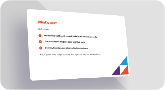 What's next We’ll review: 1 Our Summary of Benefits, which looks at the services and costs 2 The prescription drugs we cover and their costs 3 Doctors, hospitals, and pharmacies in our network And, if you’re ready to sign up today, your agent can help you with the forms.