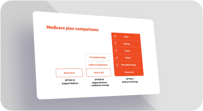 Medicare plan comparisons Vision Hearing Dental Prescription Drugs Fitness Medicare Supplement Prescription Drugs Parts A & B Parts A & B Parts A & B OPTION 1A OPTION 1B OPTION 2 Original Medicare Original Medicare Medicare Advantage +additional coverage