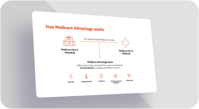 How Medicare Advantage works U.S. Government Medicare Funds Medicare Part A Medicare Part B (Hospital) (Medical) Medicare Advantage plans Federal government pays private insurance companies like Devoted Health to manage your Medicare benefits DOCTORS ADMINISTRATION HOSPITALS OTHER HEALTHCARE PHARMACIES PROVIDERS