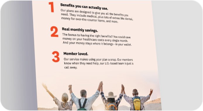 Why choose Devoted Health? Because you get a Medicare Advantage plan that gives you everything you need to feel your best. Benefits you can actually use. 1 Our plans are designed to give you all the benefits you need. They include medical, plus lots of extras like dental, money for over-the-counter items, and more. Real monthly savings. 2The bonus to having the right benefits? You could save money on your healthcare costs every single month. And your money stays where it belongs—in your wallet. Member loved. 3Our service makes using your plan a snap. Our members know when they need help, our U.S.-based team is just a call away. 11