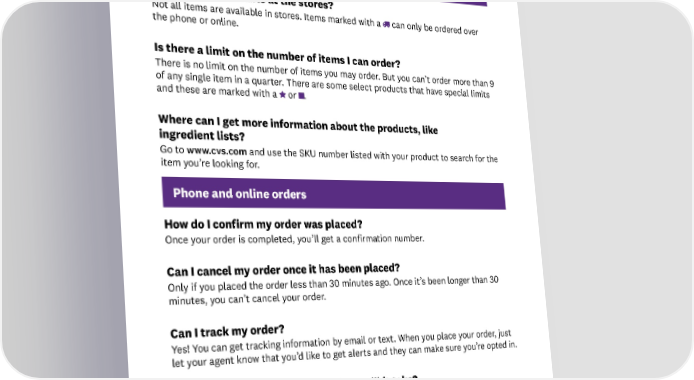 Frequently asked questions (FAQs) About the items in the catalog Are all items available at the stores? Not all items are available in stores. Items marked with a can only be ordered over the phone or online. Is there a limit on the number of items I can order? There is no limit on the number of items you may order. But you can’t order more than 9 of any single item in a quarter. There are some select products that have special limits and these are marked with a or . Where can I get more information about the products, like ingredient lists? Go to www.cvs.com and use the SKU number listed with your product to search for the item you’re looking for. Phone and online orders How do I confirm my order was placed? Once your order is completed, you’ll get a confirmation number. Can I cancel my order once it has been placed? Only if you placed the order less than 30 minutes ago. Once it’s been longer than 30 minutes, you can’t cancel your order. Can I track my order? Yes! You can get tracking information by email or text. When you place your order, just let your agent know that you’d like to get alerts and they can make sure you’re opted in. How will my order ship and how long will it take? Items are shipped via USPS at no charge to you. Delivery usually takes 5 to 7 days, though it may take a bit longer during busy times. Orders shipping to Hawaii may take up to 21 days. 34