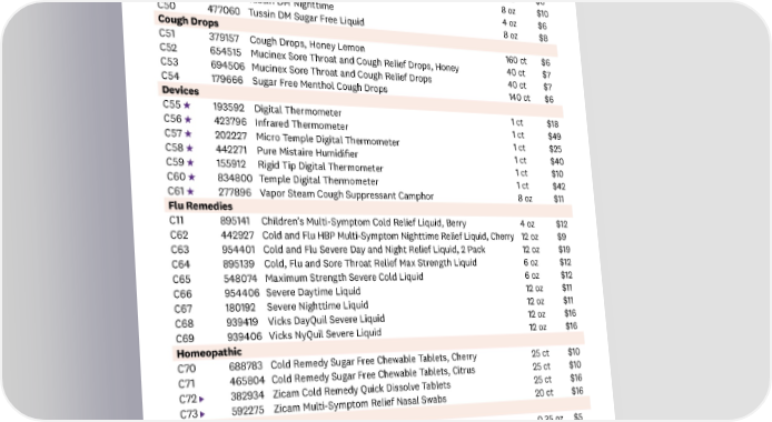CODE SKU PRODUCT SIZE PRICE Cold Remedies Cough C45 259459 Mucus Extended Release Tablets 1200mg 14 ct $16 C46 971824 Tussin CF Liquid 4 oz $7 C47 707516 Tussin DM Liquid 4 oz $6 C48 707512 Tussin DM Liquid 8 oz $10 C49 971823 Tussin DM Nighttime 4 oz $6 C50 477060 Tussin DM Sugar Free Liquid 8 oz $8 Cough Drops C51 379157 Cough Drops, Honey Lemon 160 ct $6 C52 654515 Mucinex Sore Throat and Cough Relief Drops, Honey 40 ct $7 C53 694506 Mucinex Sore Throat and Cough Relief Drops 40 ct $7 C54 179666 Sugar Free Menthol Cough Drops 140 ct $6 Devices C55 193592 Digital Thermometer 1 ct $18 C56 423796 Infrared Thermometer 1 ct $49 C57 202227 Micro Temple Digital Thermometer 1 ct $25 C58 442271 Pure Mistaire Humidi昀椀er 1 ct $40 C59 155912 Rigid Tip Digital Thermometer 1 ct $10 C60 834800 Temple Digital Thermometer 1 ct $42 C61 277896 Vapor Steam Cough Suppressant Camphor 8 oz $11 Flu Remedies C11 895141 Children’s Multi-Symptom Cold Relief Liquid, Berry 4 oz $12 C62 442927 Cold and Flu HBP Multi-Symptom Nighttime Relief Liquid, Cherry 12 oz $9 C63 954401 Cold and Flu Severe Day and Night Relief Liquid, 2 Pack 12 oz $19 C64 895139 Cold, Flu and Sore Throat Relief Max Strength Liquid 6 oz $12 C65 548074 Maximum Strength Severe Cold Liquid 6 oz $12 C66 954406 Severe Daytime Liquid 12 oz $11 C67 180192 Severe Nighttime Liquid 12 oz $11 C68 939419 Vicks DayQuil Severe Liquid 12 oz $16 C69 939406 Vicks NyQuil Severe Liquid 12 oz $16 Homeopathic C70 688783 Cold Remedy Sugar Free Chewable Tablets, Cherry 25 ct $10 C71 465804 Cold Remedy Sugar Free Chewable Tablets, Citrus 25 ct $10 C72 382934 Zicam Cold Remedy Quick Dissolve Tablets 25 ct $16 C73 592275 Zicam Multi-Symptom Relief Nasal Swabs 20 ct $16 Lip Care C74 280974 Blistex Lip Ointment 0.35 oz $5 | | | Home delivery only 1 per period 1 per year Dual-purpose item 8