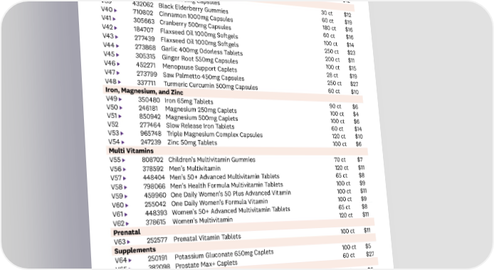 CODE SKU PRODUCT SIZE PRICE Vitamins Hair, Skin, and Nails V35 271097 Collagen + Vitamin C Tablets 120 ct $13 V36 928914 Hair, Skin & Nails Caplets 200 ct $22 V37 460133 Hair, Skin & Nails Caplets 60 ct $12 Herbal Supplements V38 710800 5-HTP 200mg Capsules 30 ct $12 V39 432062 Black Elderberry Gummies 60 ct $19 V40 710802 Cinnamon 1000mg Capsules 180 ct $16 V41 305663 Cranberry 500mg Capsules 60 ct $16 V42 184707 Flaxseed Oil 1000mg Softgels 100 ct $14 V43 277439 Flaxseed Oil 1000mg Softgels 250 ct $23 V44 273868 Garlic 400mg Odorless Tablets 200 ct $11 V45 305315 Ginger Root 550mg Capsules 100 ct $15 V46 452271 Menopause Support Caplets 28 ct $19 V47 273799 Saw Palmetto 450mg Capsules 250 ct $27 V48 337711 Turmeric Curcumin 500mg Capsules 60 ct $10 Iron, Magnesium, and Zinc V49 350480 Iron 65mg Tablets 90 ct $6 V50 246181 Magnesium 250mg Caplets 100 ct $4 V51 850942 Magnesium 500mg Caplets 100 ct $6 V52 277464 Slow Release Iron Tablets 60 ct $14 V53 965748 Triple Magnesium Complex Capsules 120 ct $10 V54 247239 Zinc 50mg Tablets 100 ct $6 Multi Vitamins V55 808702 Children’s Multivitamin Gummies 70 ct $7 V56 378592 Men’s Multivitamin 120 ct $11 V57 448404 Men’s 50+ Advanced Multivitamin Tablets 65 ct $8 V58 798066 Men’s Health Formula Multivitamin Tablets 100 ct $9 V59 459960 One Daily Women’s 50 Plus Advanced Vitamin 100 ct $11 V60 255042 One Daily Women’s Formula Vitamin 100 ct $9 V61 448393 Women’s 50+ Advanced Multivitamin Tablets 65 ct $8 V62 378615 Women’s Multivitamin 120 ct $11 Prenatal V63 252577 Prenatal Vitamin Tablets 100 ct $11 Supplements V64 250191 Potassium Gluconate 650mg Caplets 100 ct $5 V65 382098 Prostate Max+ Caplets 60 ct $27 Vitamins A, D, and K V66 199216 Vitamin A 8000iu Softgels 100 ct $6 Item list is subject to change. In the event an item is out of stock, an item of similar or greater value will be substituted in your order. If an item is recalled by the manufacturer for any reason, it will be removed from the product offering immediately. 31