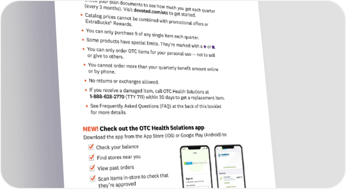 Shop our OTC items Your benefit only works for the exact items listed here. No substitutions allowed. This catalog is a complete list of what’s covered. A few helpful things to know • Check your plan documents to see how much you get each quarter (every 3 months). Visit devoted.com/otc to get started. • Catalog prices cannot be combined with promotional offers or © ExtraBucks Rewards. • You can only purchase 9 of any single item each quarter. • Some products have special limits. They’re marked with a or . • You can only order OTC items for your personal use — not to sell or give to others. • You cannot order more than your quarterly benefit amount online or by phone. • No returns or exchanges allowed. • If you receive a damaged item, call OTC Health Solutions at 1-888-628-2770 (TTY 711) within 30 days to get a replacement item. • See Frequently Asked Questions (FAQ) at the back of this booklet for more details. NEW! Check out the OTC Health Solutions app Download the app from the App Store (iOS) or Google Play (Android) to: Check your balance Find stores near you View past orders Scan items in-store to check that they’re approved Check out faster in-store with a digital barcode and more! 3