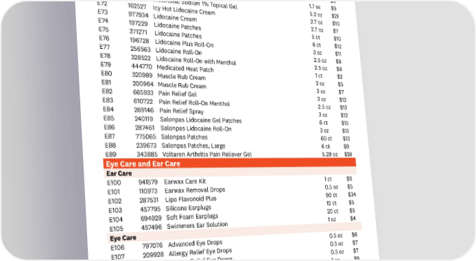 CODE SKU PRODUCT SIZE PRICE External Pain Topical Analgesic E67 695905 Cold and Hot Cream 3 oz $6 E68 827058 Cold and Hot Patches 3 ct $8 E69 957604 Cold and Hot Patches 5 ct $6 E70 161764 Diclofenac Sodium 1% Topical Gel 1.7 oz $9 E71 516173 Diclofenac Sodium 1% Topical Gel 5.2 oz $21 E72 162527 Icy Hot Lidocaine Cream 2.7 oz $10 E73 977934 Lidocaine Cream 2.7 oz $7 E74 197229 Lidocaine Patches 5 ct $10 E75 371271 Lidocaine Patches 6 ct $12 E76 196728 Lidocaine Plus Roll-On 3 oz $11 E77 256563 Lidocaine Roll-On 2.5 oz $8 E78 328522 Lidocaine Roll-On with Menthol 2.5 oz $8 E79 444770 Medicated Heat Patch 1 ct $2 E80 320989 Muscle Rub Cream 2 oz $5 E81 200964 Muscle Rub Cream 3 oz $7 E82 665933 Pain Relief Gel 3 oz $12 E83 610722 Pain Relief Roll-On Menthol 2.5 oz $13 E84 269146 Pain Relief Spray 3 oz $12 E85 240119 Salonpas Lidocaine Gel Patches 6 ct $15 E86 287461 Salonpas Lidocaine Roll-On 3 oz $15 E87 775065 Salonpas Patches 60 ct $13 E88 239673 Salonpas Patches, Large 6 ct $9 E89 343885 Voltaren Arthritis Pain Reliever Gel 5.29 oz $26 Eye Care and Ear Care Ear Care E100 941579 Earwax Care Kit 1 ct $9 E101 110973 Earwax Removal Drops 0.5 oz $5 E102 287531 Lipo Flavonoid Plus 90 ct $34 E103 457795 Silicone Earplugs 12 ct $5 E104 694929 Soft Foam Earplugs 20 ct $5 E105 457496 Swimmers Ear Solution 1 oz $4 Eye Care E106 797076 Advanced Eye Drops 0.5 oz $6 E107 209928 Allergy Relief Eye Drops 0.5 oz $7 E108 208334 Allergy Relief Eye Drops 0.5 oz $7 E109 171322 Arti昀椀cial Tears Lubricant Eye Drops 1 oz $9 Item list is subject to change. In the event an item is out of stock, an item of similar or greater value will be substituted in your order. If an item is recalled by the manufacturer for any reason, it will be removed from the product offering immediately. 15