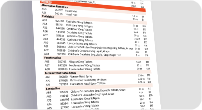 CODE SKU PRODUCT SIZE PRICE Adult care Pants A36 830475 Women’s Underwear Max, L 32 ct $22 A37 489330 Women’s Underwear Max, S/M 20 ct $14 A38 830476 Women’s Underwear Max, S/M 36 ct $22 A39 973821 Women’s Underwear Max, XL 16 ct $14 A40 830474 Women’s Underwear Max, XL 28 ct $22 Allergy Alternative Remedies A50 955517 Nasal Mist 4.6 oz $8 A51 340125 Nasal Mist 0.5 oz $7 Cetirizine A53 925507 Cetirizine 10mg Softgels 25 ct $18 A54 981751 Cetirizine 10mg Softgels 40 ct $22 A55 444236 Cetirizine 10mg Tablets 14 ct $11 A56 444238 Cetirizine 10mg Tablets 30 ct $16 A57 571851 Cetirizine 10mg Tablets 365 ct $58 A58 444255 Cetirizine 10mg Tablets 45 ct $22 A59 389345 Levocetirizine 5mg Tablets 35 ct $16 A61 566853 Children’s Cetirizine 10mg Orally Disintegrating Tablets, Orange 24 ct $19 A62 912859 Children’s Cetirizine 5mg Liquid, Grape 4 oz $9 A63 922201 Children’s Cetirizine 5mg Liquid, Grape Sugar Free 8 oz $16 Fexofenadine A66 952763 Allegra 60mg Tablets 24 ct $19 A67 847260 Fexofenadine 180mg Tablets 30 ct $18 A68 888489 Fexofenadine 180mg Tablets 90 ct $34 Intermittent Nasal Spray A69 302860 Flonase Nasal Spray 0.38 oz $19 A70 674958 Fluticasone Nasal Spray 144 Dose 0.62 oz $21 A71 797907 Fluticasone Nasal Spray 72 Dose 0.38 oz $14 Loratadine A64 195770 Children’s Loratadine 5mg Chewable Tablets, Grape 20 ct $17 A65 912845 Children’s Loratadine 5mg Liquid, Grape 4 oz $9 A73 348499 Loratadine 10mg Softgels 60 ct $30 A74 232641 Loratadine 10mg Tablets 10 ct $7 A75 277760 Loratadine 10mg Tablets 20 ct $14 A76 232642 Loratadine 10mg Tablets 30 ct $16 A77 583518 Loratadine 10mg Tablets 365 ct $45 Item list is subject to change. In the event an item is out of stock, an item of similar or greater value will be substituted in your order. If an item is recalled by the manufacturer for any reason, it will be removed from the product offering immediately. 5