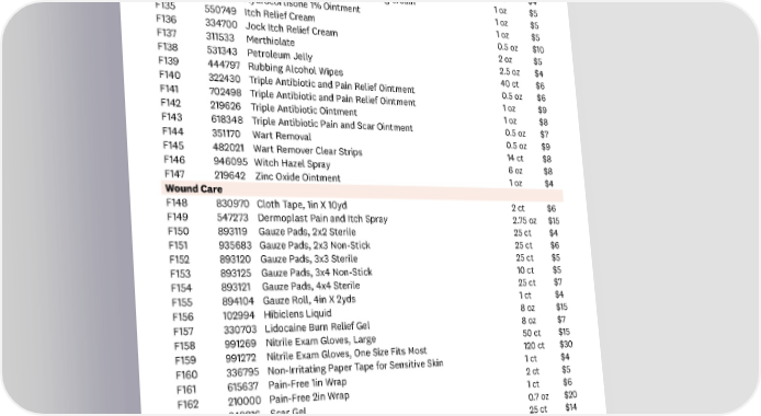 CODE SKU PRODUCT SIZE PRICE First Aid Treatments F130 963880 Exederm Flare Control Cream 2 oz $15 F131 832864 Freeze Wart Remover 2.7 oz $17 F132 373019 Hydrocortisone 1% Cream 1 oz $4 F133 690242 Hydrocortisone 1% Intensive Healing Cream 1 oz $5 F134 373092 Hydrocortisone 1% Ointment 1 oz $5 F135 550749 Itch Relief Cream 1 oz $5 F136 334700 Jock Itch Relief Cream 0.5 oz $10 F137 311533 Merthiolate 2 oz $5 F138 531343 Petroleum Jelly 2.5 oz $4 F139 444797 Rubbing Alcohol Wipes 40 ct $6 F140 322430 Triple Antibiotic and Pain Relief Ointment 0.5 oz $6 F141 702498 Triple Antibiotic and Pain Relief Ointment 1 oz $9 F142 219626 Triple Antibiotic Ointment 1 oz $8 F143 618348 Triple Antibiotic Pain and Scar Ointment 0.5 oz $7 F144 351170 Wart Removal 0.5 oz $9 F145 482021 Wart Remover Clear Strips 14 ct $8 F146 946095 Witch Hazel Spray 6 oz $8 F147 219642 Zinc Oxide Ointment 1 oz $4 Wound Care F148 830970 Cloth Tape, 1in X 10yd 2 ct $6 F149 547273 Dermoplast Pain and Itch Spray 2.75 oz $15 F150 893119 Gauze Pads, 2x2 Sterile 25 ct $4 F151 935683 Gauze Pads, 2x3 Non-Stick 25 ct $6 F152 893120 Gauze Pads, 3x3 Sterile 25 ct $5 F153 893125 Gauze Pads, 3x4 Non-Stick 10 ct $5 F154 893121 Gauze Pads, 4x4 Sterile 25 ct $7 F155 894104 Gauze Roll, 4in X 2yds 1 ct $4 F156 102994 Hibiclens Liquid 8 oz $15 F157 330703 Lidocaine Burn Relief Gel 8 oz $7 F158 991269 Nitrile Exam Gloves, Large 50 ct $15 F159 991272 Nitrile Exam Gloves, One Size Fits Most 120 ct $30 F160 336795 Non-Irritating Paper Tape for Sensitive Skin 1 ct $4 F161 615637 Pain-Free 1in Wrap 2 ct $5 F162 210000 Pain-Free 2in Wrap 1 ct $6 F163 249816 Scar Gel 0.7 oz $20 F164 489905 Surgical Face Masks 25 ct $14 Item list is subject to change. In the event an item is out of stock, an item of similar or greater value will be substituted in your order. If an item is recalled by the manufacturer for any reason, it will be removed from the product offering immediately. 19