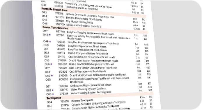 CODE SKU PRODUCT SIZE PRICE Oral Hygiene Oral Analgesic O36 634741 Kank-A Professional Mouth Pain Liquid 0.33 oz $10 O37 711642 Mouth Sore Relief Liquid 0.5 oz $7 O38 258802 Mouth Sore Rinse 16 oz $8 O39 997166 Oral Anesthetic Liquid 0.5 oz $7 O40 933834 Oral Pain Relief Gel 0.33 oz $6 O41 695108 Temporary Lost Filling and Loose Cap Repair 1 ct $4 O42 933833 Toothache and Gum Relief Gel 0.25 oz $9 Portable Breath Care O43 379375 Biotene Dry Mouth Lozenges, Sugar Free, Mint 27 ct $10 O44 497555 Biotene Moisturizing Mouth Spray 1.5 oz $10 O45 259189 Dry Mouth Melting Discs 40 ct $9 O46 998700 Spray oral hidratante, pack de 2 0.25 oz $3 Power Toothbrushes O47 897749 EasyFlex Flossing Replacement Brush Heads 3 ct $25 O48 857241 EasyFlex In昀椀nity Rechargeable Toothbrush with Replacement 1 ct $27 Brush Heads O49 422345 EasyFlex Pro Premium Rechargeable Toothbrush 1 ct $45 O50 341166 EasyFlex Replacement Brush Heads 3 ct $25 O51 415475 EasyFlex Replacement Brush Heads 5 ct $29 O53 214174 Oral-B Complete Battery Toothbrush 1 ct $9 O54 214176 Oral-B Complete Replacement Brush Heads 2 ct $9 O55 318504 Oral-B Floss Action Replacement Brush Heads 3 ct $41 O56 920657 Oral-B Pro 1000 Rechargeable Toothbrush 1 ct $72 O57 725922 Oral-B Pro-Health Clinical Power Toothbrush 1 ct $20 O58 813436 Oral-B Replacement Brush Heads 3 ct $36 O59 816008 Oral-B Vitality Floss Action Rechargeable Toothbrush 1 ct $33 O60 808698 Professional Clean Power Toothbrush with Replacement 1 ct $9 Brush Head O61 378381 Smilesonic Replacement Brush Heads 2 ct $32 O62 638777 Water Flossing System Cordless 1 ct $40 O63 378314 Water Flossing System Rechargeable 1 ct $57 Toothpaste O64 795997 Biotene Toothpaste 4.3 oz $10 O65 237416 Colgate Sensitive Whitening Anticavity Toothpaste 6 oz $7 O66 237544 Colgate Stain Fighter Anticavity Toothpaste 4.2 oz $5 O67 100032 Crest Cavity Protection Fluoride Anticavity Toothpaste 5.7 oz $3 O68 705527 Crest Complete Toothpaste with Scope 5.4 oz $5 Item list is subject to change. In the event an item is out of stock, an item of similar or greater value will be substituted in your order. If an item is recalled by the manufacturer for any reason, it will be removed from the product offering immediately. 25