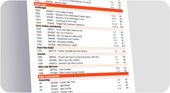 CODE SKU PRODUCT SIZE PRICE First Aid Wound Care F165 360094 Surgical Face Masks, Small 20 ct $11 F166 964606 Waterproof Adhesive Tape, 1/2in X 5yd 1 ct $2 F167 270351 Waterproof Transparent Dressings, Assorted 10 ct $9 F168 270304 Waterproof Transparent Dressings, Large 4 ct $14 F169 998839 Wound Care Kit Small/Medium, 30 Pieces 1 ct $15 F170 209024 Wound Wash 6 oz $5 Foot Care Antifungal F200 859684 Anti-Fungal Powder 2.5 oz $9 F201 334067 Athlete’s Foot Antifungal Powder Spray 4.6 oz $10 F202 521682 Athlete’s Foot Antifungal Cream 1 oz $12 F203 211003 Clotrimazole 1% Cream 0.5 oz $7 F204 743609 Fungal Nail Renewal Treatment 0.33 oz $25 Corn, Callus, and Bunion F205 139231 Corn and Callus Remover Kit 1 ct $6 F206 334560 Gel Toe Protector 1 ct $6 F207 669939 Gel Toe Spacers Value Pack 6 ct $9 F208 314468 Medicated Corn Cushion 9 ct $5 F209 894580 Moleskin Padding 2 ct $5 F210 267828 Wart Remover Liquid 0.5 oz $10 Foot Pain Relief F211 894776 Plantar Fasciitis Gel Arch Sleeve 1 ct $12 Insoles F212 489144 Double Air Foam Cushioning Insoles, One Size 1 ct $4 F213 439596 Men’s Gel Heel Cushion 1 ct $8 F214 439653 Women’s Gel Heel Cushion 1 ct $8 Odor and Wetness F215 229790 Foot Powder 10 oz $9 F216 334566 Odor Control Spray Powder 4 oz $6 Hair Accessories Grooming H1 447036 Conair Hair Pick 3 ct $4 H2 516310 Hair Brush 1 ct $4 H3 371303 Hair Combs 3 ct $4 H4 226674 Shower Caps 4 ct $10 | | | Home delivery only 1 per period 1 per year Dual-purpose item 20