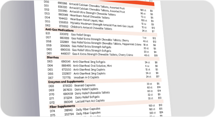 CODE SKU PRODUCT SIZE PRICE Diet Nutrition Nutrition D18 204464 Liquid I.V. Hydration Multiplier Electrolyte Drink Mix 6 ct $14 D19 264399 OWYN Protein Shake Dark Chocolate, 4 Pack 11.15 oz $10 D20 264635 OWYN Protein Shake Vanilla, 4 Pack 11.15 oz $10 Digestive Health Antacids D50 690266 Antacid Calcium Chewable Tablets, Assorted Fruit 160 ct $9 D51 836320 Antacid Calcium Chewable Tablets, Assorted Fruit 96 ct $6 D52 230995 Antacid Ultra Strength Chewable Tablets 72 ct $6 D53 860849 Heartburn Relief Chewable Tablets 100 ct $9 D54 164422 Heartburn Relief Liquid, Mint 12 oz $9 D55 236859 Mylanta Maximum Strength Antacid Plus Anti-Gas Liquid 12 oz $12 D62 878852 Children’s Antacid Chewable Tablets 24 ct $7 Anti-Gas Medications B31 330812 Gas Relief Drops 1 oz $12 D57 883928 Gas Relief Extra Strength Chewable Tablets, Cherry 48 ct $12 D58 232981 Gas Relief Extra Strength Chewable Tablets, Peppermint Crème 18 ct $6 D59 206805 Gas Relief Extra Strength Softgels 30 ct $5 D60 690035 Gas Relief Ultra Strength Softgels 20 ct $4 D61 448057 Gas-X Extra Strength Chewable Tablets, Cherry Crème 48 ct $19 Diarrhea D63 690041 Anti-Diarrheal 2mg Softgels 24 ct $8 D64 888495 Anti-Diarrheal Oral Solution, Mint 4 oz $6 D65 672550 Anti-Diarrheal 2mg Caplets 12 ct $5 D66 232907 Anti-Diarrheal 2mg Caplets 24 ct $8 D67 737715 Imodium A-D Caplets 24 ct $17 Enzymes and Supplements D68 878020 Beanaid Capsules 30 ct $6 D69 267635 Dairy Relief Caplets 60 ct $14 D70 690659 Dairy Relief Chewable Tablets 60 ct $14 D71 372214 Dairy Relief Softgels 32 ct $9 D72 393041 Lactaid Fast Act Caplets 32 ct $13 Fiber Supplements D74 318142 Daily Fiber Capsules 100 ct $10 D75 252794 Daily Fiber Capsules 160 ct $15 D76 348642 Daily Fiber Capsules 320 ct $24 D77 958326 Daily Fiber Sugar Free Powder 10 oz $9 | | | Home delivery only 1 per period 1 per year Dual-purpose item 10