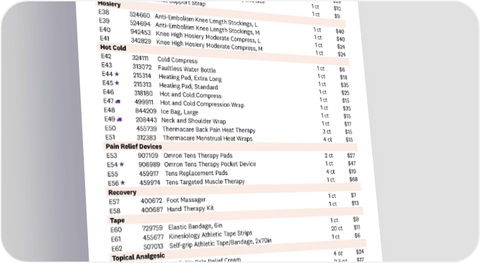 CODE SKU PRODUCT SIZE PRICE External Pain Brace E33 963366 Wrist Compression Support 1 ct $10 E34 138214 Wrist Stabilizer, L/XL 1 ct $29 E35 138206 Wrist Stabilizer, S/M 1 ct $29 E36 462605 Wrist Support Deluxe Compression, One Size 1 ct $10 E37 902106 Wrist Support Strap 1 ct $9 Hosiery E38 524660 Anti-Embolism Knee Length Stockings, L 1 ct $40 E39 524694 Anti-Embolism Knee Length Stockings, M 1 ct $40 E40 942453 Knee High Hosiery Moderate Compress, L 1 ct $24 E41 342829 Knee High Hosiery Moderate Compress, M 1 ct $24 Hot Cold E42 324111 Cold Compress 1 ct $6 E43 313072 Faultless Water Bottle 1 ct $18 E44 215314 Heating Pad, Extra Long 1 ct $35 E45 215313 Heating Pad, Standard 1 ct $25 E46 318180 Hot and Cold Compress 1 ct $15 E47 499911 Hot and Cold Compression Wrap 1 ct $35 E48 844209 Ice Bag, Large 1 ct $15 E49 208443 Neck and Shoulder Wrap 1 ct $17 E50 455739 Thermacare Back Pain Heat Therapy 3 ct $15 E51 312383 Thermacare Menstrual Heat Wraps 4 ct $15 Pain Relief Devices E53 907109 Omron Tens Therapy Pads 2 ct $27 E54 906989 Omron Tens Therapy Pocket Device 1 ct $47 E55 459917 Tens Replacement Pads 4 ct $19 E56 459974 Tens Targeted Muscle Therapy 1 ct $68 Recovery E57 400672 Foot Massager 1 ct $7 E58 400687 Hand Therapy Kit 1 ct $13 Tape E60 729759 Elastic Bandage, 6in 1 ct $8 E61 455677 Kinesiology Athletic Tape Strips 20 ct $11 E62 507013 Self-grip Athletic Tape/Bandage, 2x70in 1 ct $6 Topical Analgesic E63 459362 Arthritis Pain Relief Cream 4 oz $24 E66 214395 Biofreeze Roll-On 2.5 oz $17 | | | Home delivery only 1 per period 1 per year Dual-purpose item 14