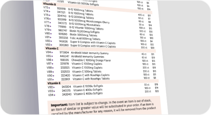CODE SKU PRODUCT SIZE PRICE Vitamins Vitamins A, D, and K V67 162640 Vitamin D3 10,000iu Softgels 60 ct $16 V68 346754 Vitamin D3 1000iu Softgels 100 ct $9 V69 695912 Vitamin D3 1000iu Softgels 300 ct $16 V70 710787 Vitamin D3 2000iu Softgels 100 ct $9 V71 277289 Vitamin D3 400iu Softgels 100 ct $4 V72 717911 Vitamin D3 5000iu Softgels 100 ct $14 Vitamin B V73 928918 B-12 1000mcg Tablets 400 ct $17 V74 247321 B-12 1000mcg Tablets 60 ct $7 V75 204743 B-12 2000mcg Tablets 60 ct $9 V76 933919 B-12 5000mcg Microlozenges Cherry 30 ct $14 V77 343572 B-12 5000mcg Microtablets 100 ct $15 V78 711999 B-12 Vitamin 1000mcg Tablets 200 ct $10 V79 965747 Biotin 10,000mcg Softgels 60 ct $12 V80 931260 Biotin 5000mcg Tablets 150 ct $22 V81 300258 Folic Acid 800mcg Tablets 100 ct $4 V82 145626 Super B Complex with Vitamin C Caplets 100 ct $12 V83 300260 Super B Complex with Vitamin C Caplets 300 ct $29 Vitamin C V84 973804 Airshield Adult Immunity Gummy 42 ct $11 V85 446547 Airshield Immunity Gummies 63 ct $19 V86 166595 Chewable C 1000mg Orange Flavor 100 ct $15 V87 231878 Vitamin C 1000mg Caplets 100 ct $15 V88 232025 Vitamin C 1000mg Caplets 200 ct $19 V89 232553 Vitamin C 500mg Tablets 250 ct $13 V90 223420 Vitamin C with Rosehips Caplets 100 ct $11 V91 222901 Vitamin C with Rosehips Tablets 100 ct $8 Vitamin E V92 243204 Vitamin E 1000iu Softgels 50 ct $18 V93 240515 Vitamin E 400iu Softgels 100 ct $14 V94 242040 Vitamin E 400iu Softgels 250 ct $22 Important: Item list is subject to change. In the event an item is out of stock, an item of similar or greater value will be substituted in your order. If an item is recalled by the manufacturer for any reason, it will be removed from the product o昀昀ering immediately. | | | Home delivery only 1 per period 1 per year Dual-purpose item 32